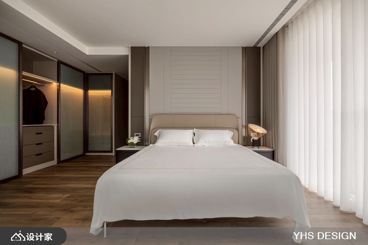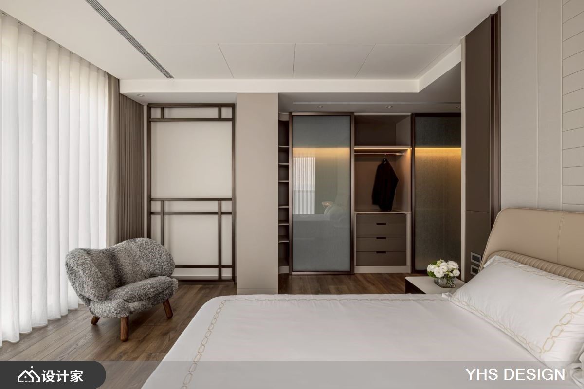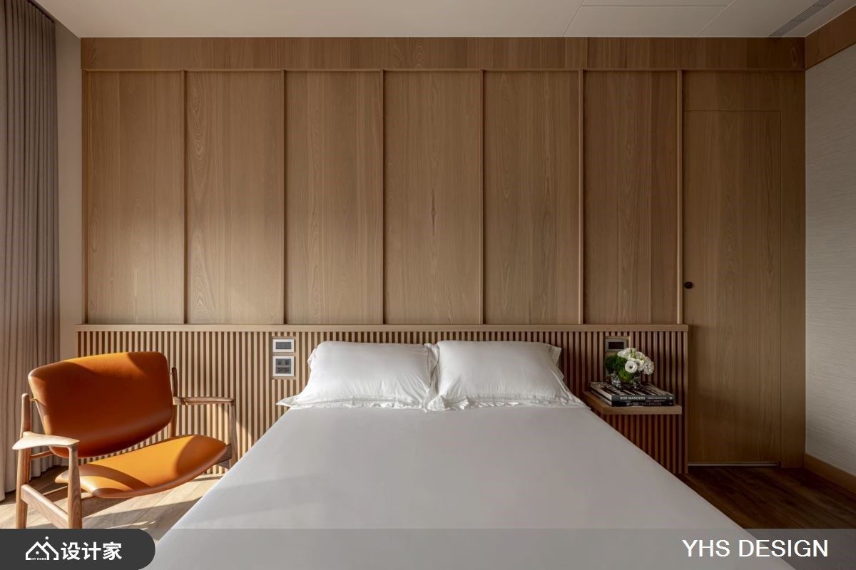 主卧以酒店式概念规划,透过巧妙动线配置,为寝卧空间筑起一层过渡缓冲。大幅留白的设计,不仅带来静谧氛围,也提供居者阅读、冥想或运动的多元弹性。衣柜门片舍弃传统形式,改采雾玻材质,透光不透影的特性,避免压缩走道视觉,同时守护衣物不受尘埃侵扰。其余卧室亦依照使用者需求量身打造,温润木质调构筑出温馨的孝亲房,而富有现代感的儿童房,则成为充满想象力的疗愈天地。