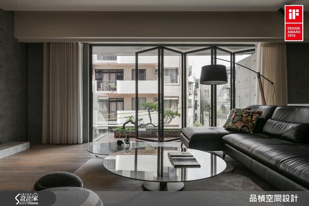 为未来的退休生活做准备,企业家屋主买的新成屋,设计师以材质铺饰清朴润泽的色调,并加入考虑银发族生活的细节设计,而阳台处规划绿意植栽和水池,大面玻璃折叠窗引景入室,为132平米居宅绘上疗愈舒适的自然原色。 【玄关以坡道打造高龄友善设计】走进室内,屏风以