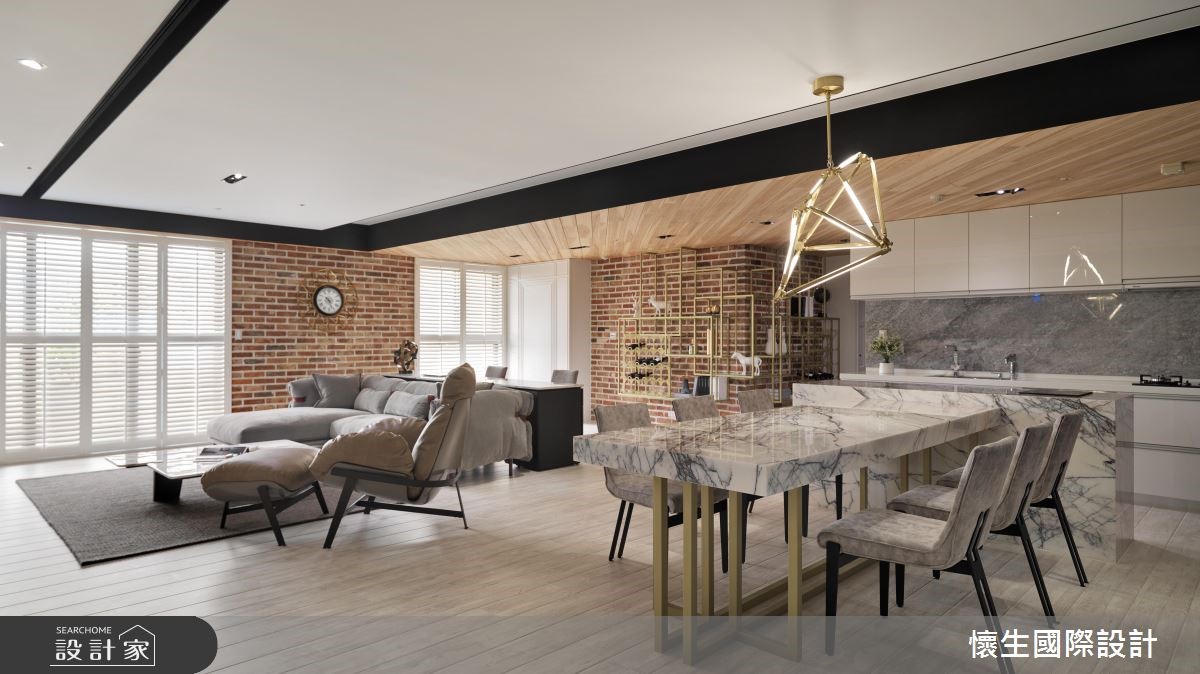 曾经拥有良好装修经验的屋主,这次再度找上当年合作过的翁嘉鸿设计师,运用前卫的造型、利落的线条,以美式风为基底,佐入新潮的前卫思维,使居家无处不是亮点。【以金色细节,对比粗犷复古砖】以木材料串联天地壁,并加入金色铁件框塑,带来异材质的趣味,天花板亦勾勒