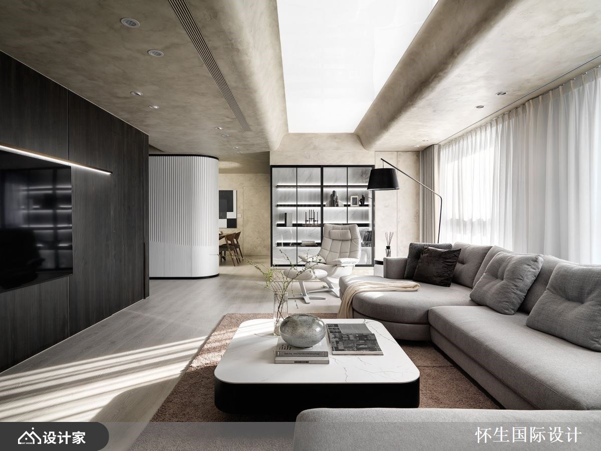 264 平米酒店风人文宅邸,透过格局重整,将三十年以上老屋改头换面,呈现简约质感气息,并利用异材质及灯光等搭配,明亮空间,开拓视野,营造静谧纾压家居氛围。入门后,映入眼帘的清水模沙发背墙,利用隔板放置特色艺术品,成功化身端景墙。客厅区白色电视主墙兼具