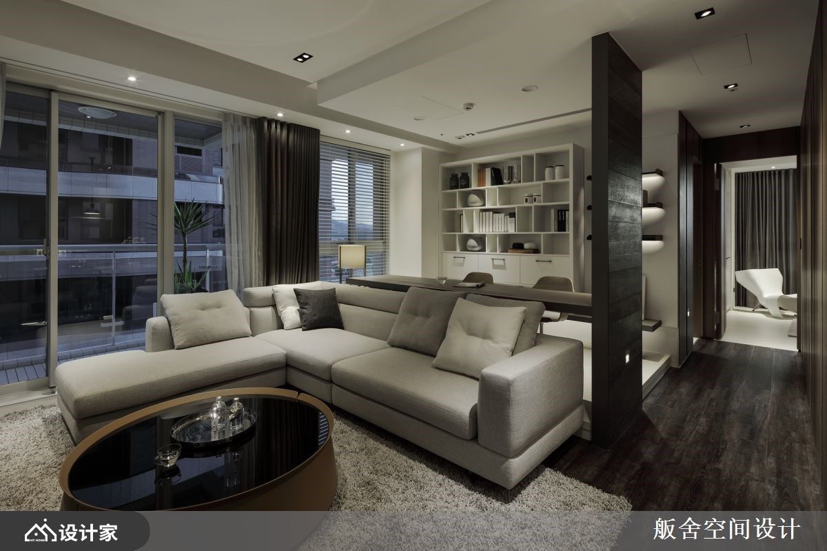 由于非常喜爱设计师夹层的作品,期待家中也能展现如此设计。整体空间以男性为主要的风格定调,调和灰阶与深色木纹,营造出内敛且安定的家屋气息。大面采光的优势,引入充沛的户外自然光,让空间不大且白色为基底的室内更显开阔。白色系磁砖打造电视墙,半高墙体结合跃层