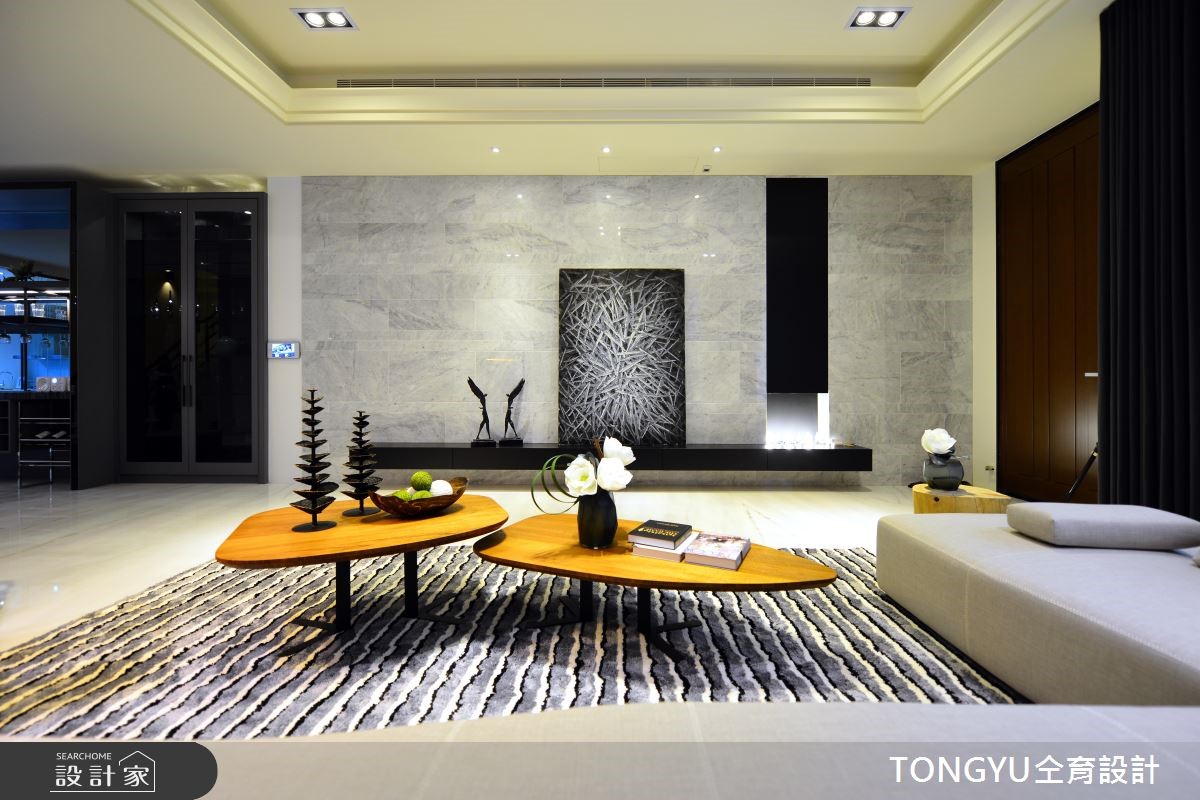 70 坪现代风大宅,以木纹石材与大理石纹定调主视觉,低彩度带出内敛沉稳的空间品味,并运用绿色植栽点缀空间色彩及注入室内活力 ! 大面积石纹电视墙将客厅区视觉延伸扩容,皮质沙发与地毯等软件选用互相搭配,呈现低调奢华质感。餐厅区展示收纳摆置许多美型花器,