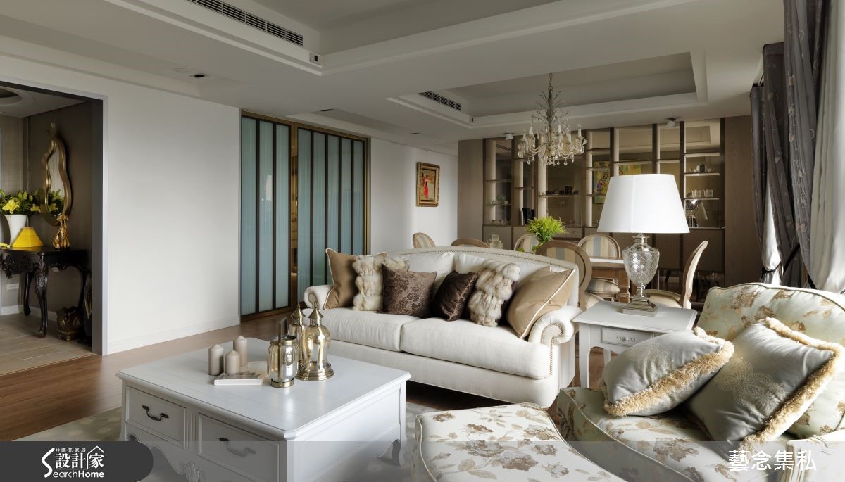 设计师以美式软件做大量铺排,强调优雅与舒适的生活体会,且加入通透设计,使场域视野得以串联延伸,并纳入光影带来温暖丰富的生活表情。【浅色木元素注入自然气息】走进家门,可见深色木作玄关桌的端景摆置,以桌体雕花呼应镜子流线造型,增添低调古典的氛围;采用木地