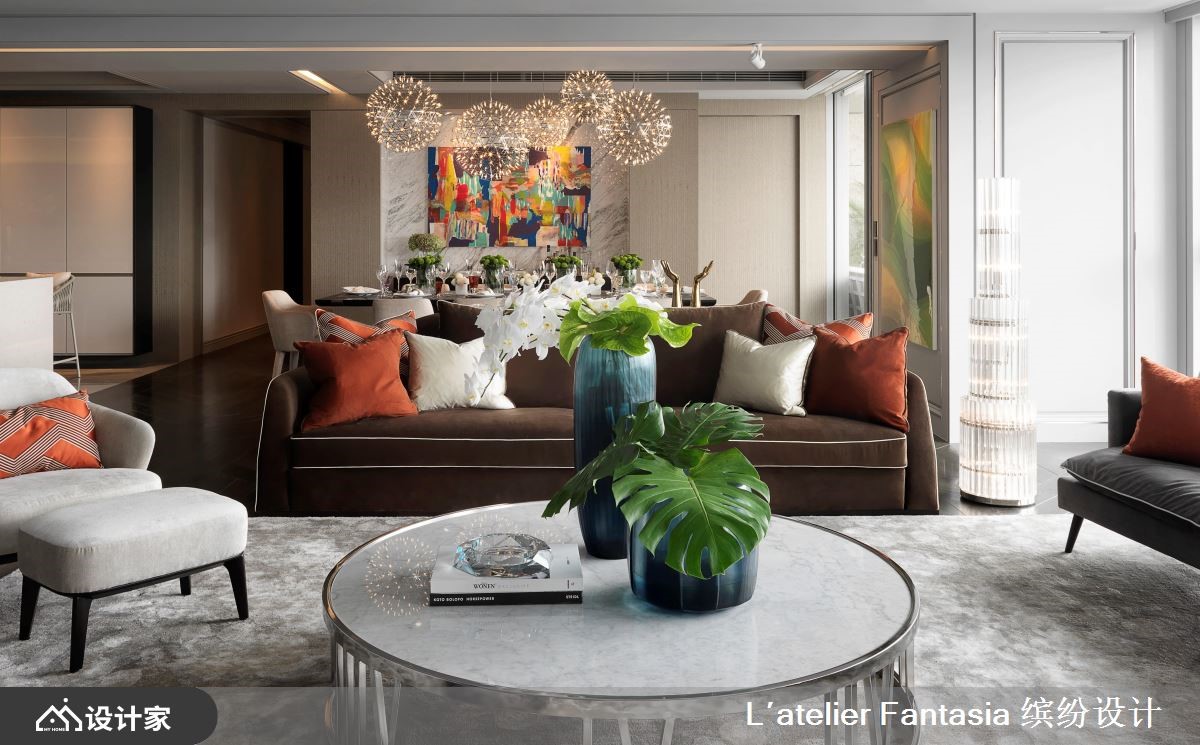 缤纷设计团队擅长结合艺术与精品,刻划出美学新品味,此次遇见从事时尚产业的女屋主,精准掌握个人特质与艺术见解,激荡出设计火花,让百坪大宅里,处处流露高端订制的设计细节;从国外挑选布料的风格沙发、家饰水晶,以及壁面陈设的东方美学、餐桌上花艺陈列,交织出奢