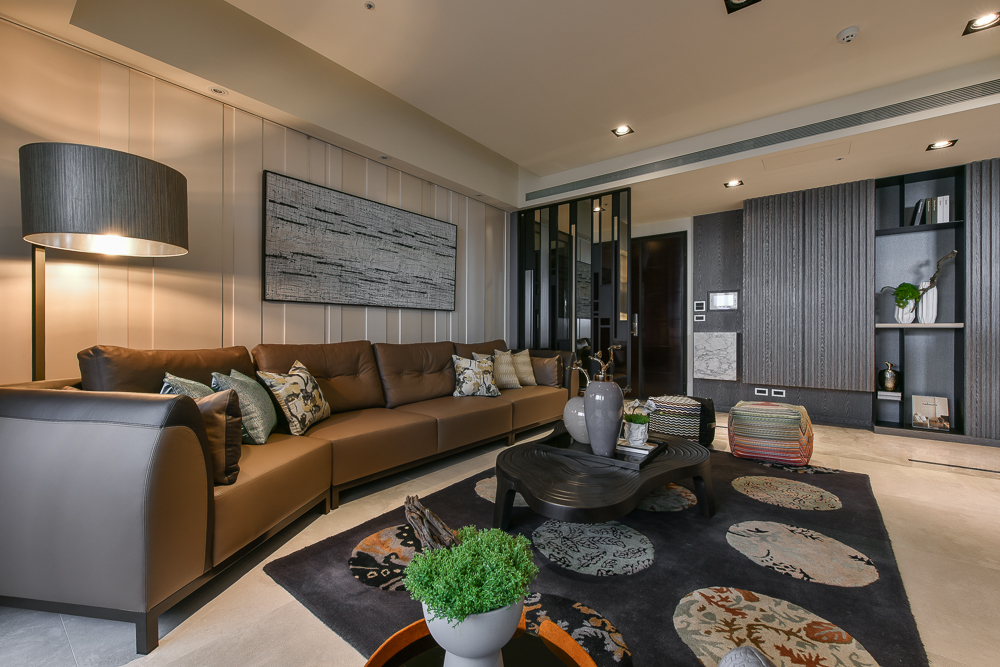 客厅主墙上,特别利用手工漆料做为材质,表现有如山水泼墨画般的墙面肌理,并在天花加入镀钛板装饰,搭佐黑白色的对比反差,修饰掉梁柱的压迫感受,且达成平衡空间比例的作用。