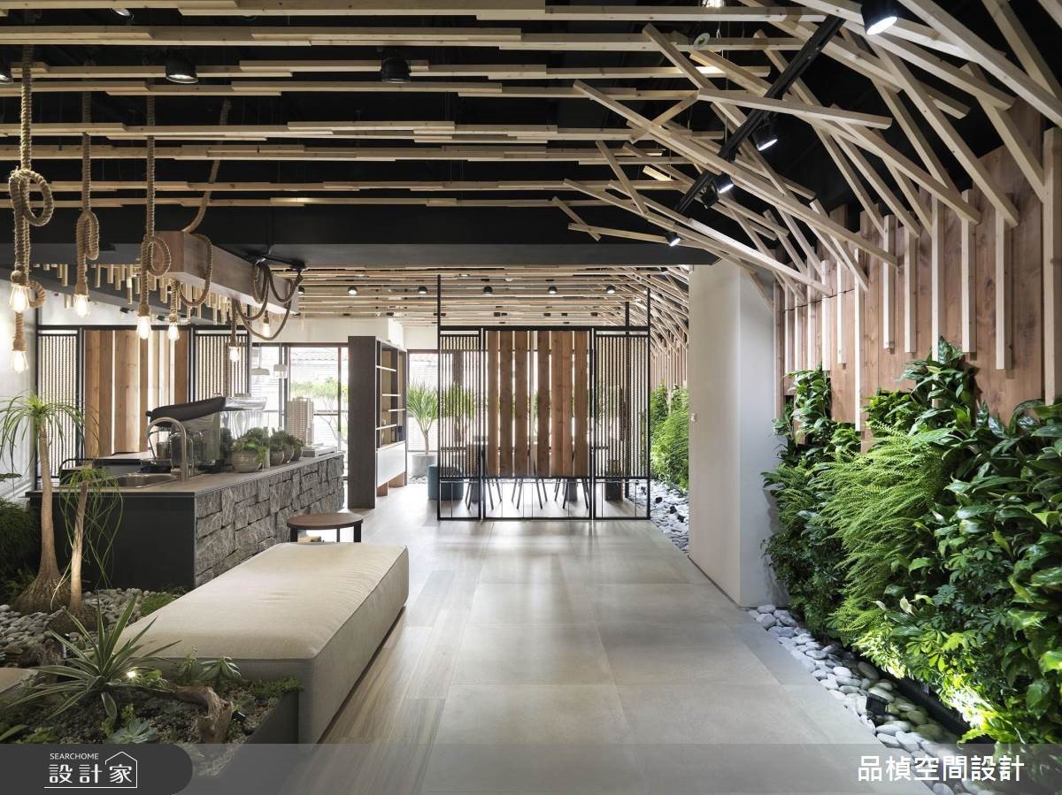 空间整体区划出洽谈、吧台、办公、卫厕等场域,运用穿透的隔断、不做满的量体等,型塑场域的采光自由度,并巧妙加入生气盎然的绿色植物,让植栽攀藤而上,木作则有如横放于天际的树枝,不仅虚化原有的结构梁柱,也搭接起整体的流畅脉络,拉大了场域的宽阔尺度。