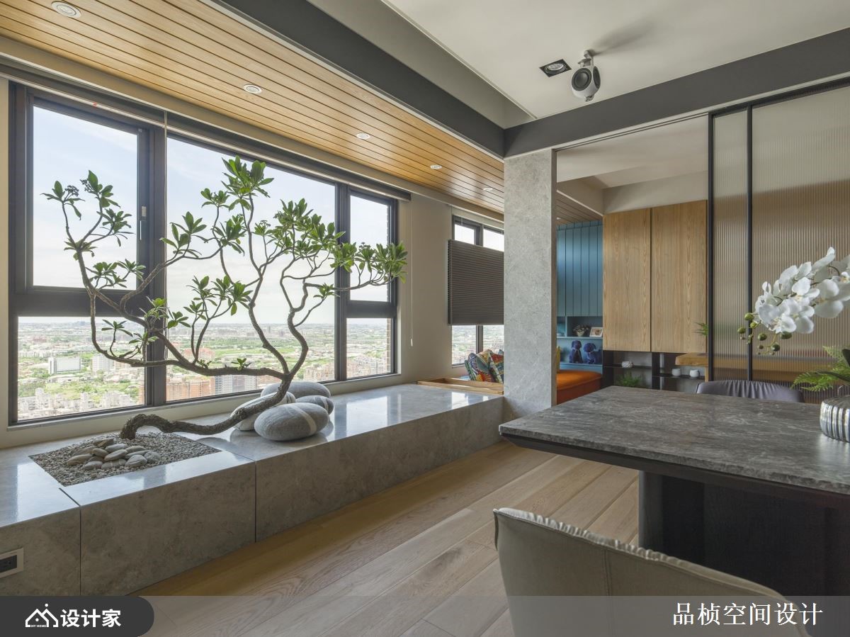空间中最吸睛的飘窗区,将平日常见于庭院的植株造景带进客厅,为退休生活注入满满活力,打造室内最纾压的端景角落!另外,与半开放设计的书房飘窗串联,延伸惬意氛围。