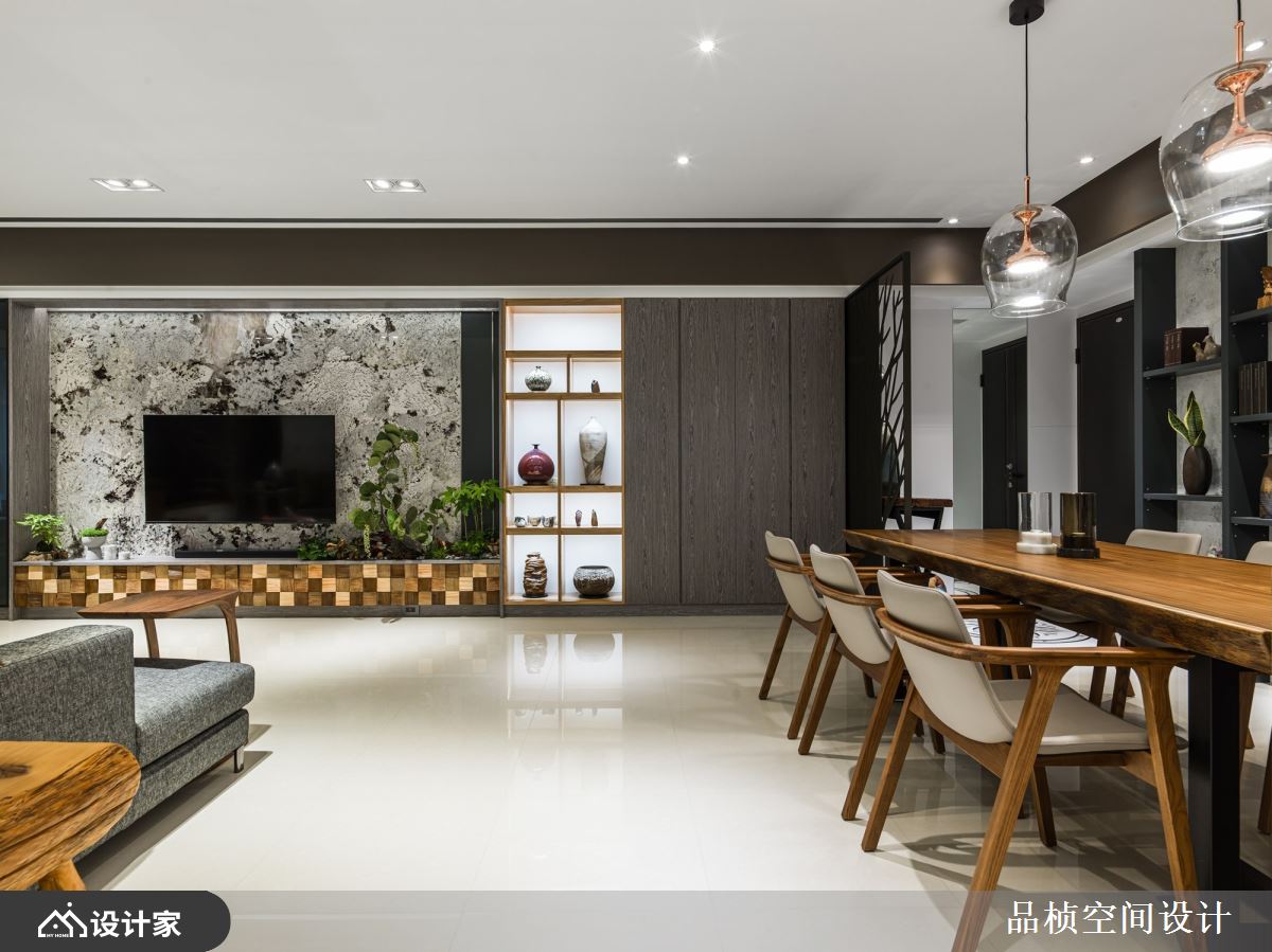 餐厅区墙面也延续了客厅电视墙的泼墨纹理,且在壁面嵌入木层板结合镀钛金属,型塑独特的展示平台,可用以摆放珍藏酒类与家饰品等,美观兼具实用,天花上方更配置充满未来感的造型灯具,瞬间点亮用餐气氛!