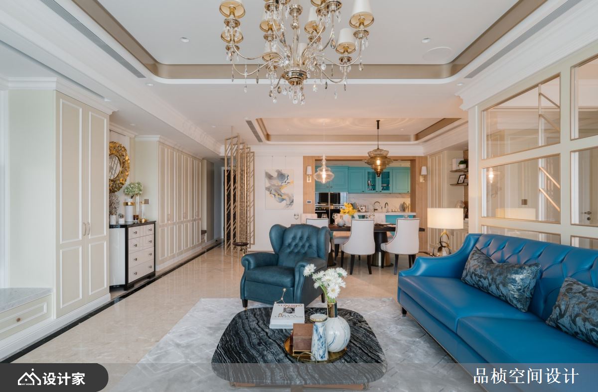 客厅将电视主牆当作大型画布,运用天然质感的硅藻土及手工漆挥洒,打造一幅抽象水彩画,蓝绿相互渲染的色彩铺排,呼应佈满花草的空间意象。餐厅区同样围绕着花草主题,座椅选用上搭配吊灯色系,传达清新优雅气息,天花板灯光设计以男屋主的星座铺排,为两夫妻的用餐时光,营造甜蜜浪漫氛围。私领域,将屋主喜爱的桧木一起带入空间,藉由自然减压的木质香气,加乘夫妻俩的睡眠品质。