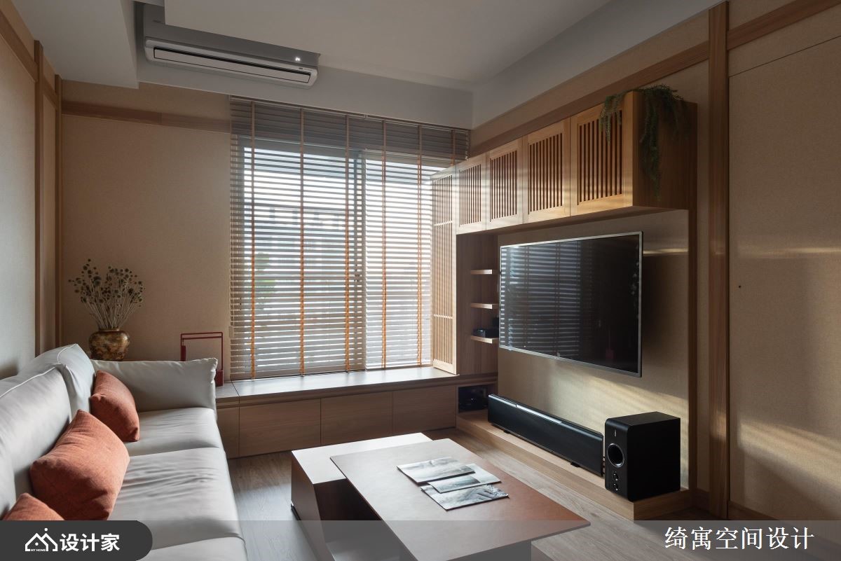 由于小宅拥有美好视野与充分采光,所以设计师在公领域保持开放式的规划,让光线能够照亮整个空间,且在窗边配置下方藏有收纳的飘窗,随意拿起一本书,就能徜徉于自己的小世界中。室内所有柜体的门片皆用桧木实木定制,并涂上透气漆,能够保护门片又自然散发桧木香气,让身体感到满满的疗愈。