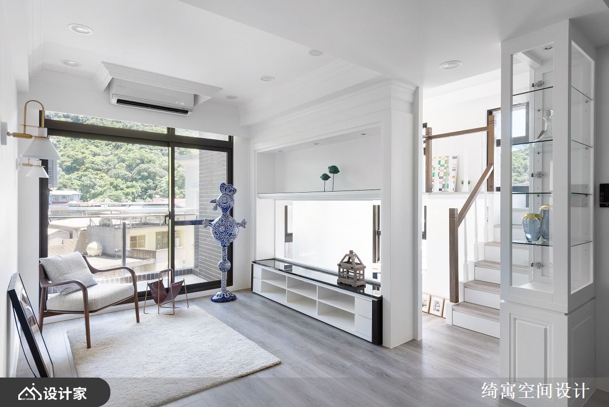 屋外大片绿意如何融入室内,为此住宅设计重点之一,视觉设计上运用纯白耐看的美式风创造自然清新的生活感,简约耐看并适度留空,下一代入住时能拥有更多自由发挥的空间。原格局无法完整展现窗外景色,且客厅外与树梢距离过于贴近,于是将客厅与卧室对调,并稍稍移动厨房位置,让敞开大门即能感受到宽敞的生活视野。收纳规划则善用梯下畸零处增添储藏位置,给予小坪数住宅更多收纳可能。