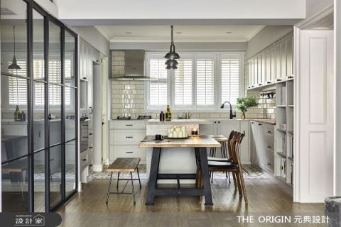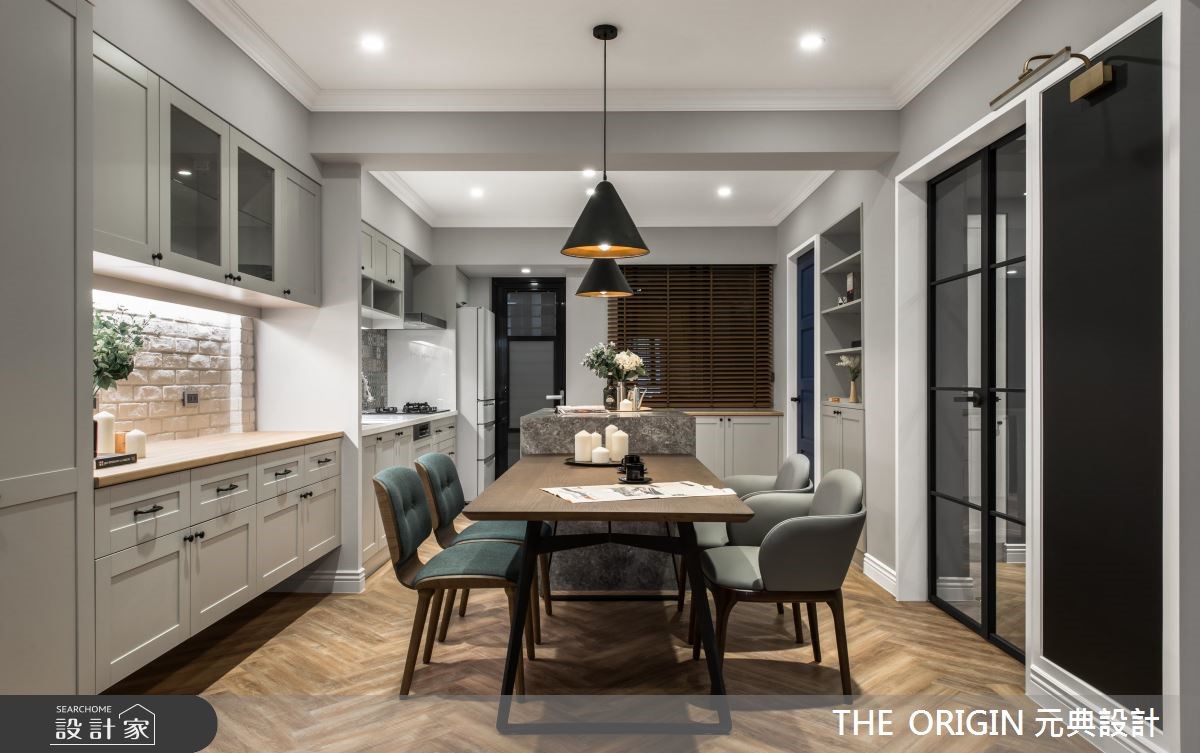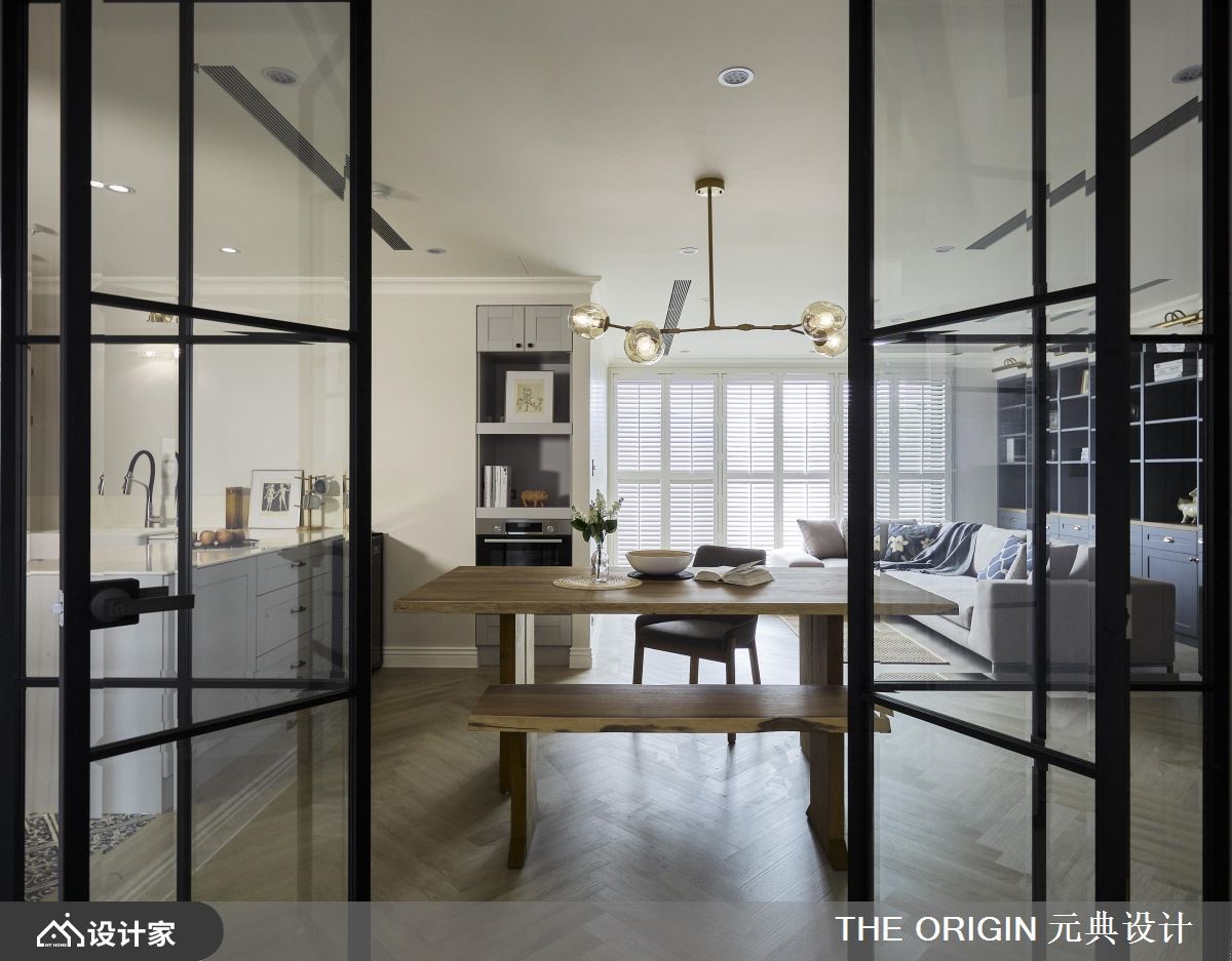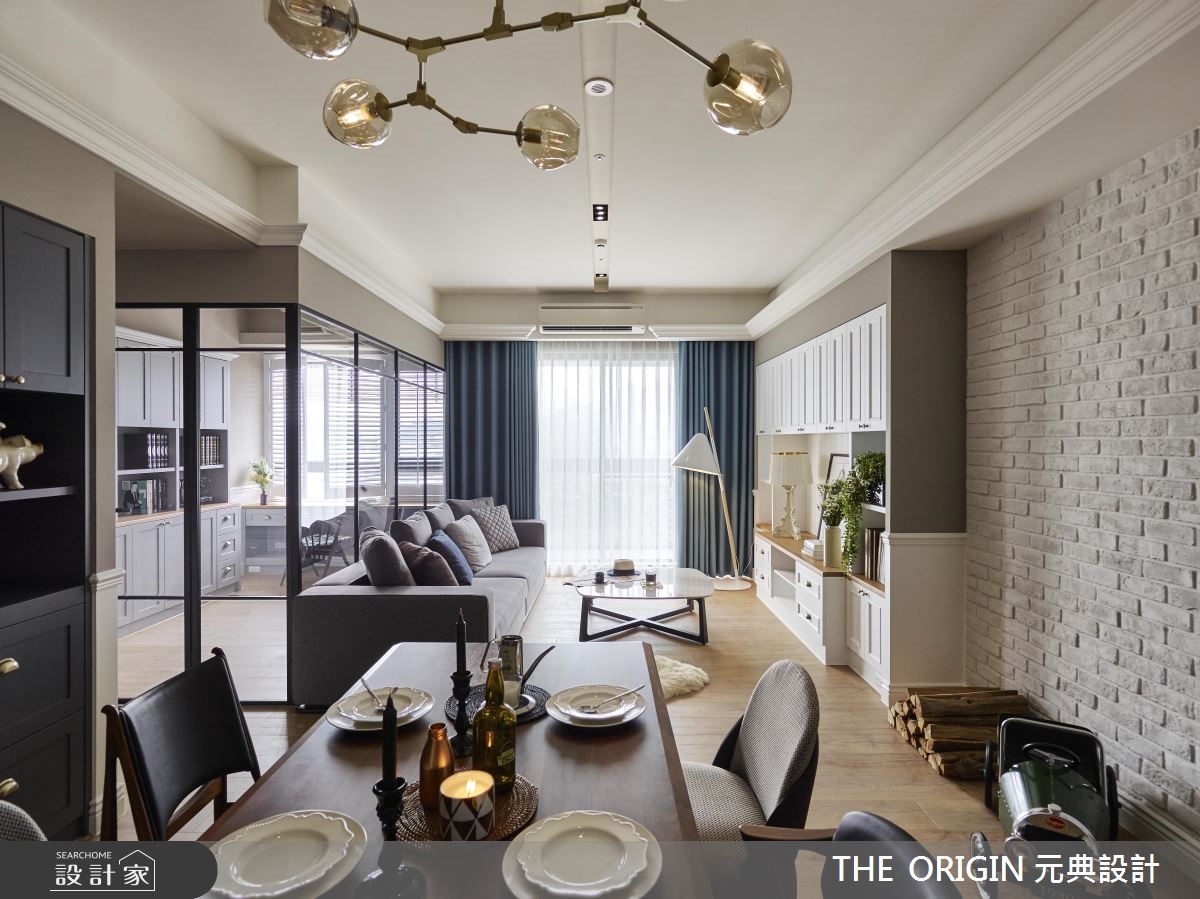 设计师採以开放式格局打造公领域,选定简约的美式风设计,运用淡雅的浅灰色贯穿全室,在静谧恬淡的背景之中,适度以线板妆点壁面、天花和柜体,使纯净场域跳出细緻的层次效果;餐厨区域,则特别选用木质餐桌椅,平衡淡灰的冷调,局部带入复古的砖材,堆叠樸质乡村氛围,而一旁更配置通透的玻璃隔断,将场域隔阂化于无形,使视线及光线可延伸穿透,带来通透放大效果;卫浴设计,同样引用活泼的砖面,让空间设计感十足,酝酿愉悦的洗浴体验!