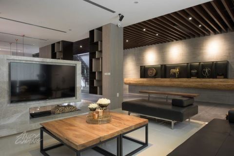 进入玄关,墙面上不加修饰的原木展示区随即映入眼帘,搭配木格栅天花与廊道光线,形成动线和视觉的指引,让人有如置身美术馆的展览情境;开放式的公共领域则利用地坪与柜体区分不同生活区块,不仅能串联各场域,也让视野更加穿透延伸。