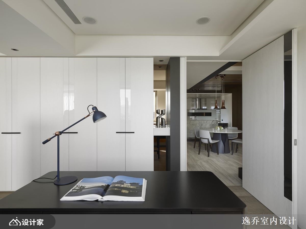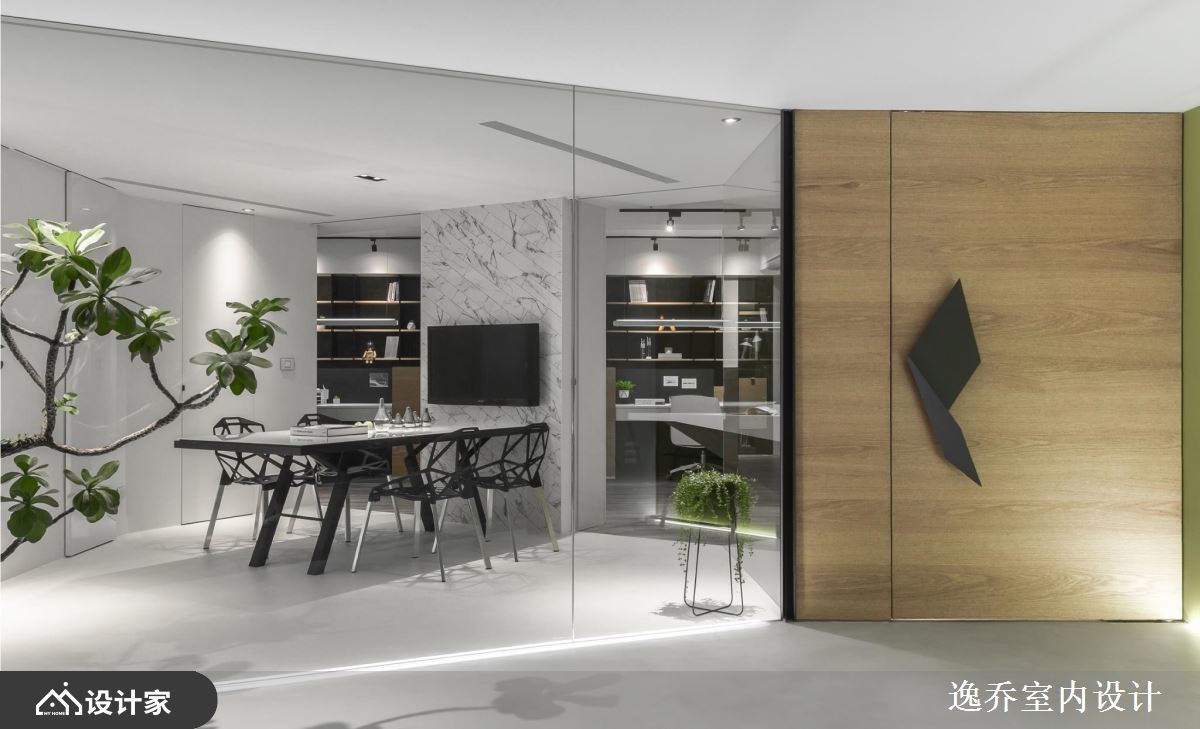有限的空间里,透过大量的白色饰底,入口处以穿透感的玻璃材质打造,打破空间界线,在壁面还透过开放层架的安排,空间随之展现放大、舒心之感,让人爱上工作!