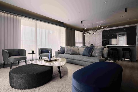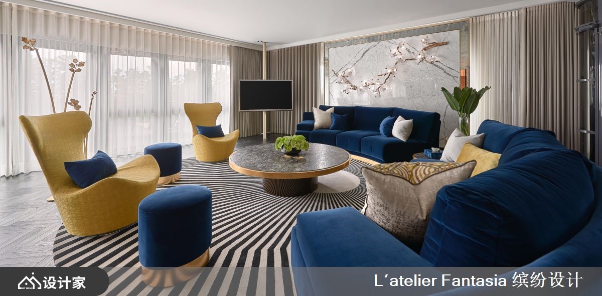 丰富的元素与质地透过精湛的细节诠释与堆栈,成就一幕幕具魔力的视觉画面,在干净色系为基底的串连下,又流露出和谐、摩登的时尚氛围。客厅里以弧形构图,一袭圆形、放射状的黑白地毯由缤纷艺术精心设计,营造出人与人之间的弹性互动;深蓝绒布质感沙发、单椅与黄、金属材质饰边的茶几、椅子对话,烘托强烈的戏剧氛围;为呼应东方文化里沙发靠背的思维,沙发后方打造一面诗意的装置艺术墙,同时设置轨道可弹性左右滑动门扇。