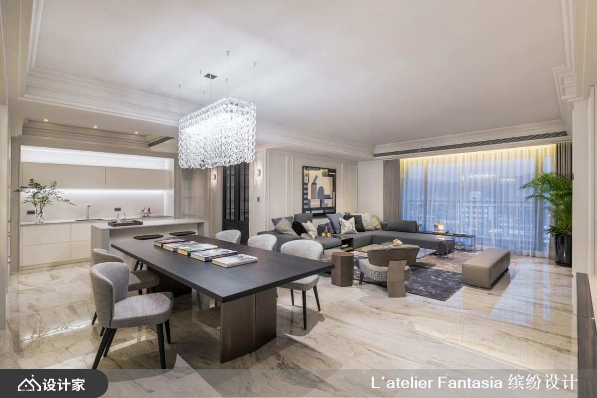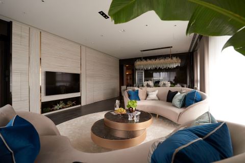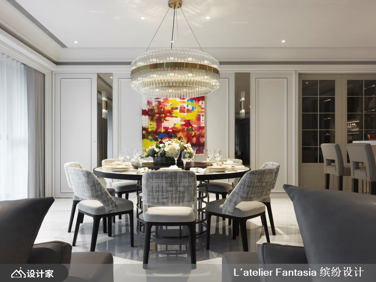 缤纷设计团队擅长结合艺术与精品,刻划出美学新品味,此次遇见从事时尚产业的女屋主,精准掌握个人特质与艺术见解,激荡出设计火花,让百坪大宅里,处处流露高端订制的设计细节;从国外挑选布料的风格沙发、家饰水晶,以及壁面陈设的东方美学、餐桌上花艺陈列,交织出奢华大器的宅邸气度。