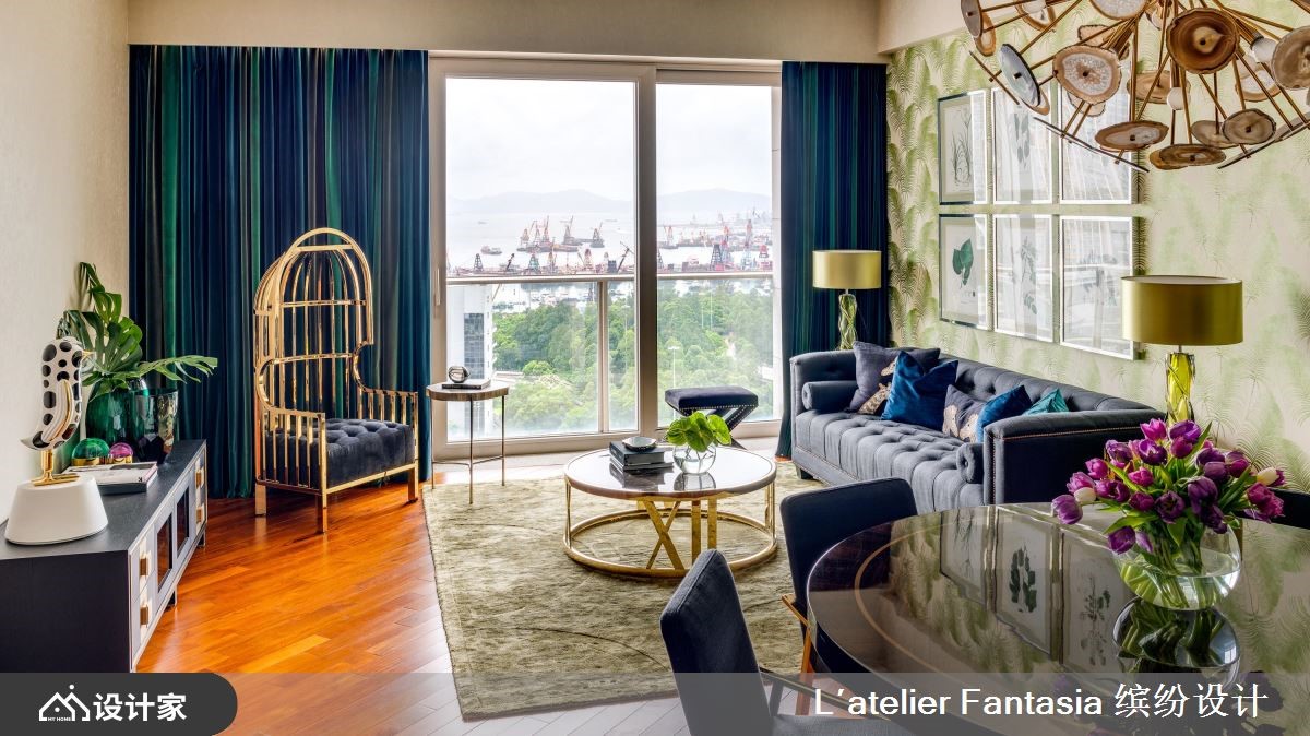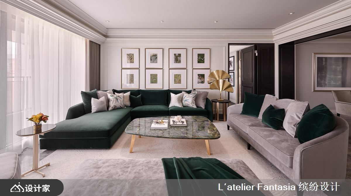 从不同时代的美学风格中汲取创作灵感,新古典、现代、Art Deco 及殖民时代的特色兼容并蓄,最终诠释出品味生活的样貌。整体公领域以自然感的绿色系为基调,衬上宝石蓝、祖母绿、金属材质,低调展现场域的层次。进门处的玄关区域,以一盏刻意降低高度的吊灯做为整个空间的序曲,传达沉稳奢华的开端;客、餐厅相邻,法国进口的顶级绒布窗帘与四时光影巧妙融合,与角落金色线条的主人椅,光泽华美、彼此映衬,餐厅区域则透过精选的玛瑙艺术灯饰,让视觉效果更富张力;Jaime Hayon 的《神奇动物俱乐部》、Jeff Koons 《气球狗Balloon Dog》等精心挑选的艺术品具有画龙点睛之效,更含情蕴意,流露家主的品味和生活温度。