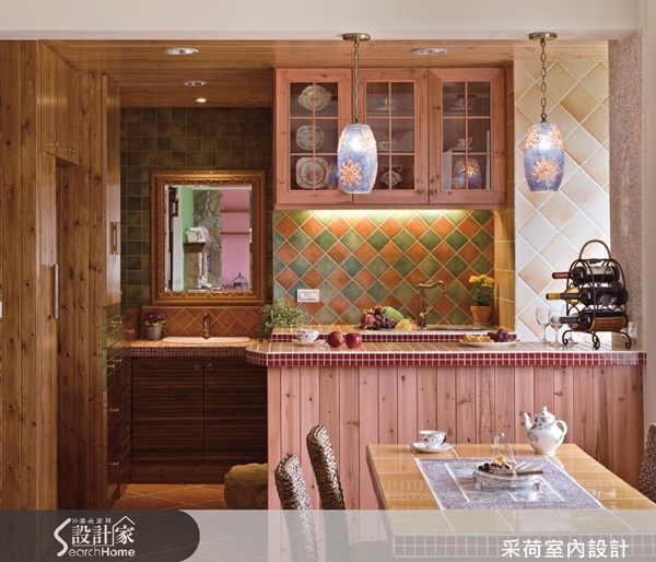 <老空間新層次>將原本30年的老屋格間大轉移,浴室與房間的結合成為餐廚空間與衛浴的層次鋪陳,餐桌與廚房的適切距離,結合吧台式中島與後方吊櫃的三個高低落差,西班牙復古磚的釉面與無上釉的交錯運用,讓英式鄉村風展露無遺。良好的收納與風格存在緊密結合,松木染色的櫃體做為空間區隔,中間可嵌入大型冰箱,一側則成為雜物食品櫃,另一方則留給客浴使用。圖片提供©采荷室內設計工作室