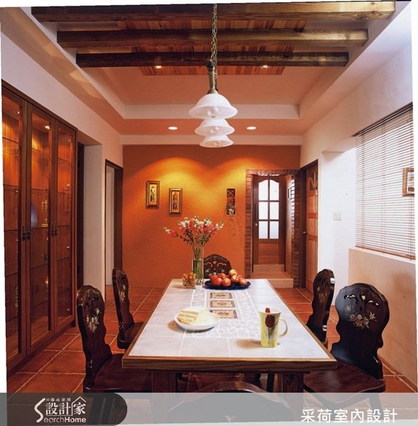 <手工牆面的鑲嵌質地>餐廳端景同時以牆與門做出視覺表現,橘色牆面以手工拉毛做為漆面處理,並特意將12CM厚牆打透出兩個小方塊,飾以窯燒素磚窗花,搭配垂墜綠植栽,與牆面融合出寫意風情。門框處的紅磚亦是表情做足的一環,來自南方傳統窯燒工法,讓精緻感勝添一筆。圖片提供©采荷室內設計工作室