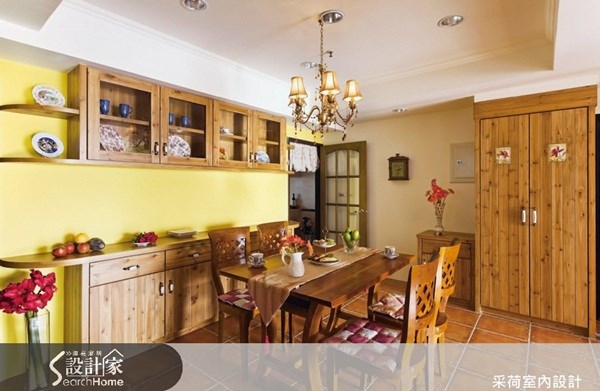 <不做滿的櫃牆融合設計>以橘黃為主色調的餐廳空間,無論是木色與地坪的選用,甚至於牆面都充滿了濃重的鄉村氣息,緊鄰著餐桌的背牆運用不做滿的櫃體,上下平行出實用機能,穿透展示以及料理收納共存。櫃牆的收邊以圓弧方式隱入牆面,柔合收尾,讓櫃體更顯輕巧。圖片提供©采荷室內設計工作室