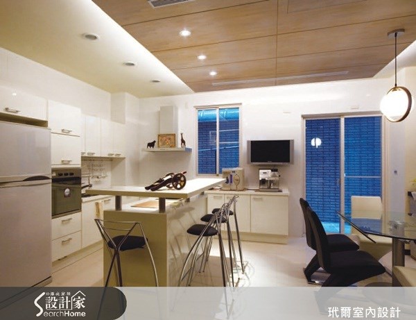 <輕鬆互動的穿透動線>以白色將爐具、電器整合至空間之中,在寬實的木造天花下,規劃成開放式的廚房與餐廳利用島型吧台加以區隔,具有穿透性的動線,讓齊聚一堂的好友可在同一空間中輕鬆互動,卻又不互相干擾。圖片提供©玳爾設計