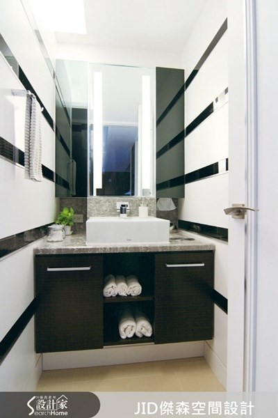 <墨鏡對應印度黑石的黑色時尚>捨棄一般規格化浴室的思考,設計者利用墨鏡與印度黑石的巧妙搭配,讓原本隱密的浴廁空間頓時展露時尚大器,尤其是平滑及水沖面兩種印度黑石的交互搭配,提供實用的止滑功能,還能豐富視覺變化。圖片提供©JID傑森空間設計