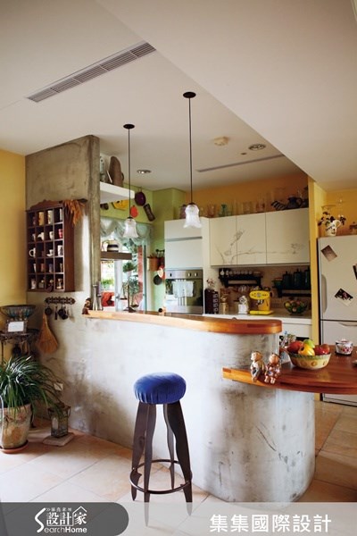 德式鄉村小廚房 充滿自然鄉村感的小廚房空間,用白色矮牆做為吧台,下方貼附 仿卵石石片,做為視覺裝飾也做為踢腳板功能,整座吧台飾以木 邊條,帶出德式味道,而整體氛圍再搭配10x10 的復古地磚, 以及廚房內的實木開窗,輕快十足的料理小空間,自然地成形。 圖片提供©集集設計