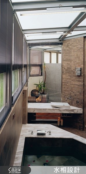 <木與石的自然語彙>設計師在最靠近大自然的角落規劃一浴室空間,大面積開窗與霧面玻璃天花,將大量的自然光線引進室內,為了減低石材質感給人的冷冽感受,以戶外綠意、室內植栽與木質板凳調和空間氛圍,加上局部燈光與蠟燭增加沐浴好心情。圖片提供©水相設計