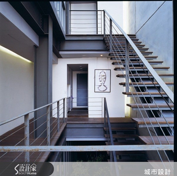<粗獷而大器的口字梯>串連不同樓層的室內梯,因為大樓的空間夠寬敞,於是可以選擇像戶外梯般粗獷的設計。與建築結構的H型鋼結合,用鋼構梯最原始的面貌呈現,踏階鋪上實木,降低了行走於其上,鏗鏘有聲的鐵件共鳴。