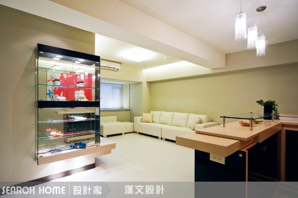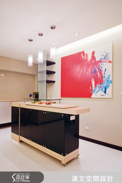 利用燈光規劃整齊線條 設計師在移動式吧檯後方的牆面裝設的間接燈光, 搭配吧台上方的三盞小型主燈,界分出了吧台的空 間區域,而間接燈的規劃與吧台對齊,也暗示了空 間中的整齊線條,在視覺上造成更精準的效果。圖片 提供©漢文空間設計