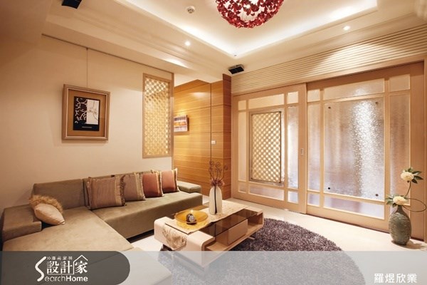 <拉門引渡採光至無對外窗客廳>客廳與書房之間捨棄封閉式隔間的作法,改以大面積的拉門方式呈現,玻璃拉門結合木刻窗花的設計,達到空間使用的區隔與視覺延伸的效果,讓沒有對外窗的客廳也能透過分享書房採光,提高空間的明亮度。圖片提供©羅煜欣業/空間設計