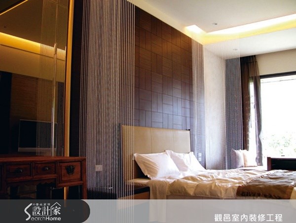 <有形與無形的牆>材質的價值,取決於運用的巧妙。不需要奢華的建材,也能創造華美的空間。主臥的床頭主牆,以木皮割線條與紋路交錯的變化,創造視覺焦點。床邊兩側,則以珠簾做空間區隔。有形與無形的牆,打造品味不凡的空間。圖片提供©觀邑室內裝修工程
