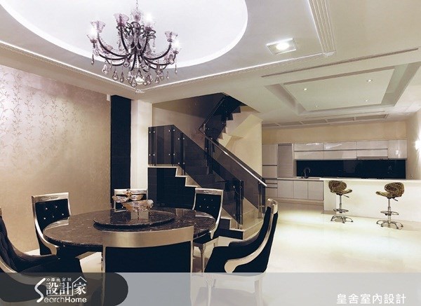 <色彩強烈的維多利亞風> 維多利亞風格情調中,那反覆出現在餐椅、大理 石餐桌、樓梯的強烈黑色調,運用壁紙、圓形天 花板的明亮間接照明加以調和,並且在水晶吊燈 的晶瑩提亮之下,為空間帶出畫龍點睛的精彩。 圖片提供©皇舍室內設計