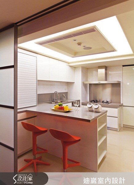 <交織著禪意的暖白調廚房> 乾淨的白、暖木色是空間設計的基調,餐廚之間是拉門,當兩區 連成一氣,中間也是以白色吧台串聯,紅色吧台椅為廚房熱度加 溫,讓廚房看起來時尚感十足,又帶有幾許禪意的靜修雅致。 圖片提供©迪崴設計