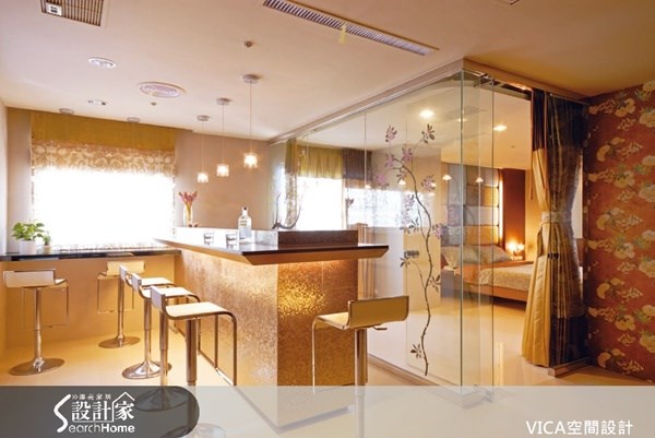 高吧檯與玻璃臥房的互動 重新規劃老房子格局時,打掉兩間房,放大公共空間與主臥室,且主臥採玻璃隔間設計,宛如一個通透的玻璃屋,搭配落地簾的設置,適時提供臥房隱私。拉開簾子,高吧檯也能半遮掩房間,又不影響視覺穿透。 圖片提供©VICA空間設計事務所