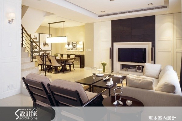 <壁爐式的主牆設計> 美式空間裡的協調感主要在於轉化式設計,機現 代感的電視牆主題弱化,以壁爐感為重點。壁爐 上方以30X60的黑色版岩鋪陳,框架則為白色萊 姆石,成功營造出黑白對比的強烈風格,之後再 透過邊側的白色收納櫃體,以及線條修飾,都上 主牆成為視覺停駐焦點。 圖片提供©珥本設計