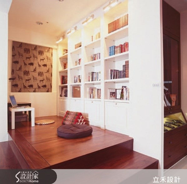 櫃體的雙面使用 此處為客廳的一個空間,設計師結合書房與和室 房概念規劃出閱讀與休憩的區域,藉由多元化的 設定讓使用面向更廣。在櫃體設計上,L型的櫃體 讓閱讀區與走道皆有收納機能,讓空間使用更加 靈活。 圖片提供©立禾室內設計