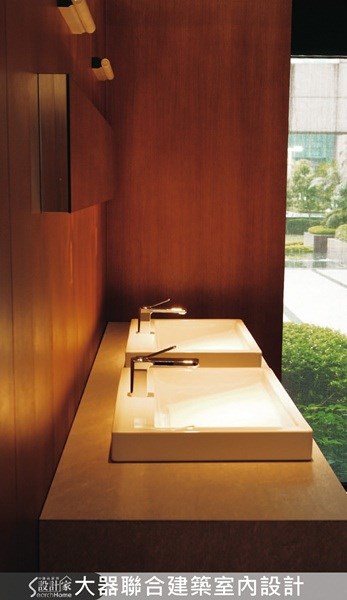 <深色木皮襯托出石材金屬質感> 以垂直貼深色木皮的方式,來營造出牆面的唯 美,木皮特別選擇經過防水處理的,因此不用擔 心溼氣的問題,木皮運用於浴室相當罕見,卻可 以襯托出金屬與石材的低調質感。 圖片提供©大器聯合建築暨室內設計事務所