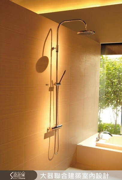 <直線式織紋強化空間張力> 在淋浴區的主牆面上,以織紋的石材質感的磁磚 鋪平整面,該磁磚具有防水抗菌的特質,並且優 雅細緻的直線紋路,順著水平線而產生透視效 果,強化空間張力。 圖片提供©大器聯合建築暨室內設計事務所