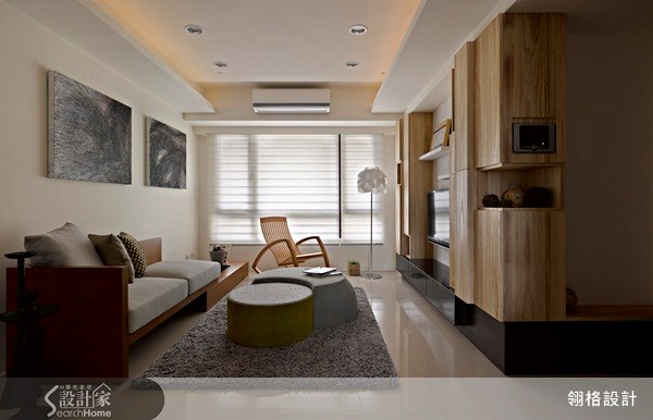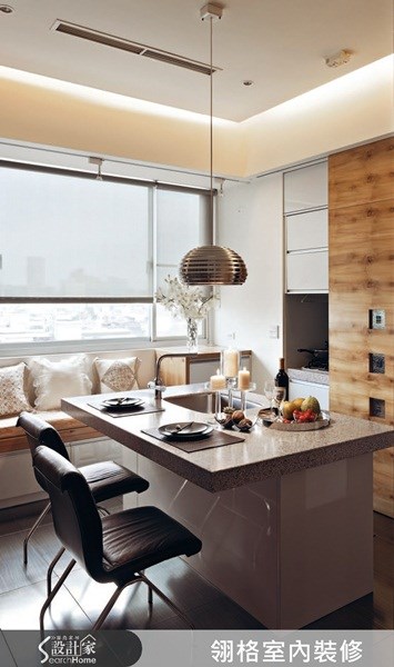 <渡假風情的自然廚房>從玄關望向回字型的餐廳、廚房,設計者利用拉門的設置,讓該區得以維持封閉與開放的高度自由性,材質選用則以烘托渡假風情為首要考量,讓粗獷自然的木紋肌理引動渡假想像。 圖片提供©翎格設計
