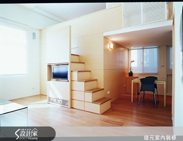 <延伸而上的機能主牆>小坪數的建構概念,不只是從單純的機能完善、提供身心休憩出發,提升至透過介面的整合,激發感官想像與實踐美好生活。於此摒除傳統的牆面,以延伸而上的主牆(兼具TV牆、收納櫃機能、與樓上空間的介面關係)表現開闊而機能豐渥的空間價值。圖片提供©造元室內裝修