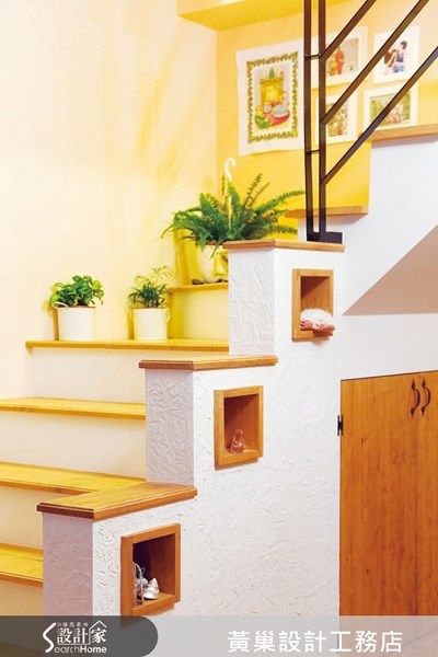 運用斑駁白牆營造鄉村風樓梯。這個樓梯使用會散發香氣、觸感溫潤的松木來當作樓梯板,是個充滿鄉村風風格的樓梯,下樓梯旁以批土做表面,充滿斑駁與生活時光累積的感覺,樓梯下的空間用來做收納,既不浪費空間、也不會太過明顯,同時更具有實用性。