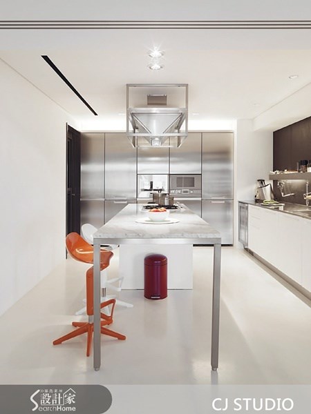 一塊白大理石,是餐桌也是烹調區 位於獨立廚房空間內的小餐桌連結烹調區,共享 同一塊卡拉拉白大理石。既是料理食物的中島、 備餐檯,亦是夫妻親密談話的小餐桌。搭配兩張 magis彩色塑料升降椅,以檯面下的結構支撐—白 色量體或金屬桌腳的變化,定義使用機能。 圖片提供©CJ STUDIO 陸希傑