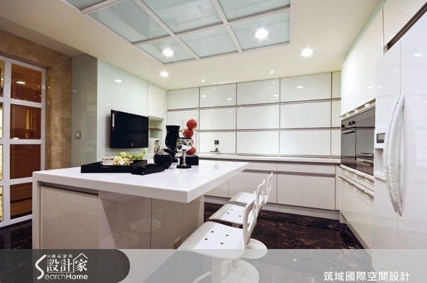 <超白玻璃的運用打造美式大宅廚> 餐廚之間的門框以鐵件烤白漆的處理,突顯白色廚房的優雅氣 質,廚房空間加大後,運用進口廚具、德國五金、超白玻璃與人 造石中島台面,打造讓女主人更幸福的下廚空間。 圖片提供©筑域設計