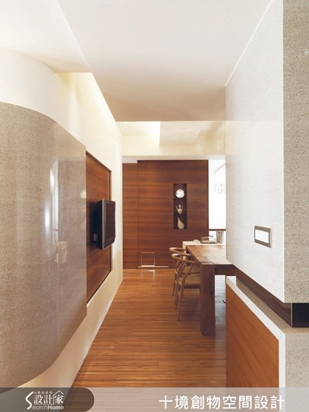 <讓兩地空間在轉角相遇> 客廳與餐廳共用一轉角牆體,弧形的流動感引出 了兩地電視牆的風貌,摩卡棕大理石的亮滑特 質,搭配餐廳牆體終點的柚木貼皮,點出如畫之 捲軸般的設計。此外,左側牆面將浴室門片與收 納展示櫃面清爽收羅成一視覺牆,同樣運用木紋 貼皮,呈現完整鋪陳。 圖片提供©十境創物空間設計