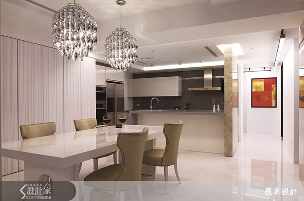 <收納櫃化身柔美的牆>餐櫃利用大型門片將整體美化,使收納櫃體隱身在淺色空間之中,化為一道低調裝飾牆,而不同於採用白色烤漆廚具的光亮感,門片細密的線條表情柔和,讓用餐氛圍更加輕鬆,同時可垂直延伸視覺感,讓空間高度向上延展。圖片提供©長禾設計
