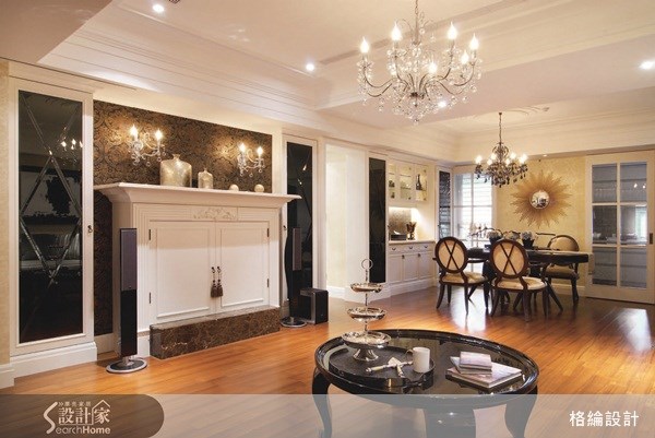 <牆面的琳派華麗> 電視櫃以壁龕的形式呈現,避免電器設備破壞室內整體氛圍,以線板與浮雕裝飾的櫃體,其上擺放窄口寬身的金色銀斑瓶飾,兩旁的仿水晶燭台壁燈,並襯著花紋繁複的壁紙,熠熠生輝的華麗感,有如一幅添入金箔創作的日本琳派畫作。 圖片提供©格綸設計工程