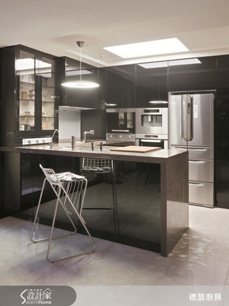 <以中島區分開放空間> 客餐廳開放為一體的空間,將廚具與電器櫃歸納於靠牆面,成一 字型排列,並以隱形爐灶、全隱藏式烘碗機、抽油機,讓廚房保 持美觀大方,並配合空間風格以黑白相間的中島,成為兩空間的 區分。 圖片提供©德盟廚具