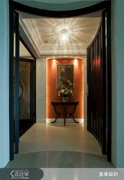 外玄關。以白色的對稱式英式壁板及間接照明,烘托出外玄關主牆磚紅色的鮮明視覺印象,層疊而上的天花線板造形,吸引賓客一進門的驚艷目光。