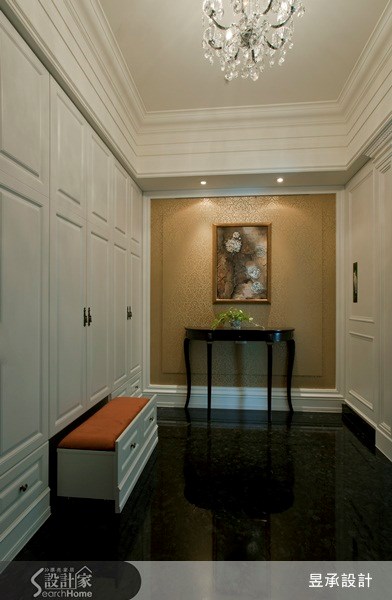 內玄關。以雍容華貴的金色壁紙帶出視覺主景,主牆兩側分別是鞋櫃及採隱藏設計的公共衛浴入口,而羅馬柱造形的方型拱門,則巧妙地將視覺動線帶入公共區域。